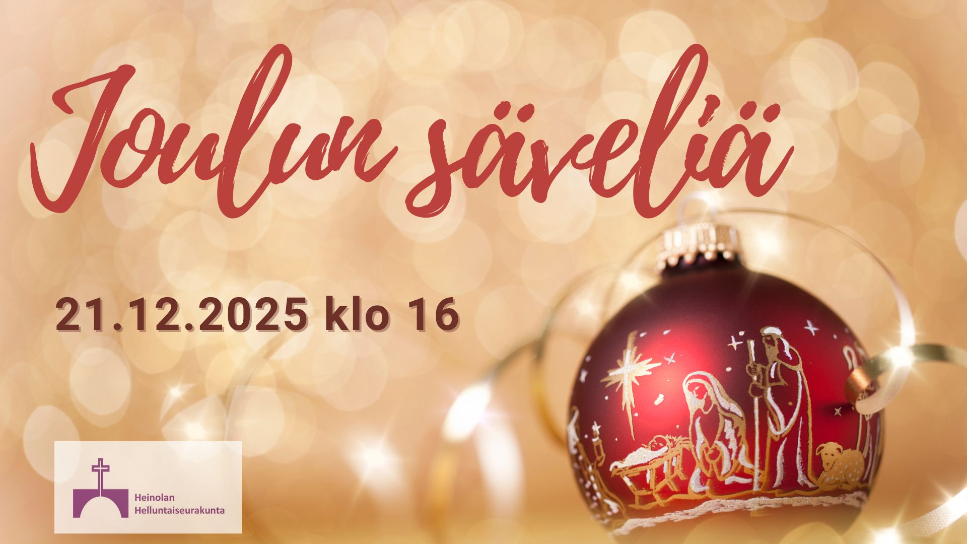 Joulun säveliä Mukana mm. Veikko Juurikkala Väliajalla glögi-tarjoilu Lämpimästi tervetuloa! + Lisää Google kalenteriin + iCal / Outlook export Päivä joulu 21 2025 Aika 16:00 - 17:30 Jaa tapahtuma
