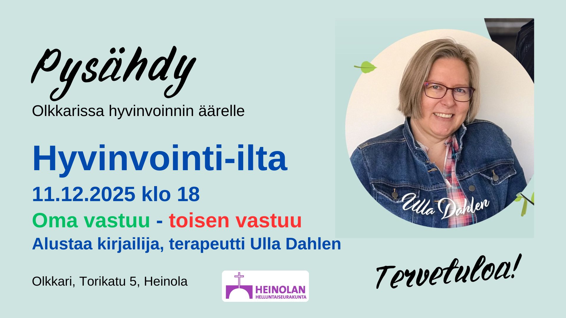 Olkkarin Hyvinvointi-ilta + Lisää Google kalenteriin + iCal / Outlook export Päivä joulu 11 2025 Aika 18:00 - 19:15 Sijainti Olkkari, Torikatu 5 Jaa tapahtuma