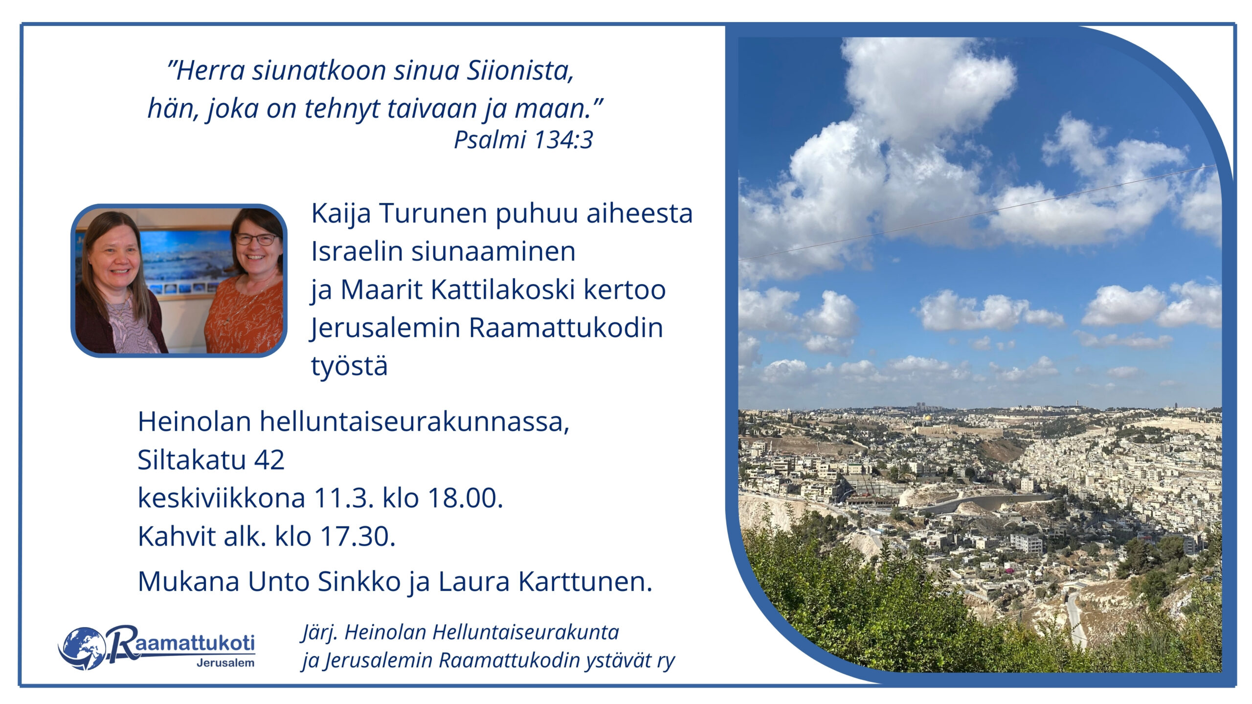 Raamattukodin ystävät -ilta Vierailemassa Maarit Kattilakoski ja Kaija Turunen. Musiikissa Laura Karttunen. Kahvitarjoilu klo 17:30 alkaen Tilaisuudessa kerätään vapaaehtoinen rahalahja Jerusalemin Raamattukodin työntukemiseen Lämpimästi tervetuloa! + Lisää Google kalenteriin + iCal / Outlook export Päivä maalis 11 2026 Aika 18:00 Jaa tapahtuma