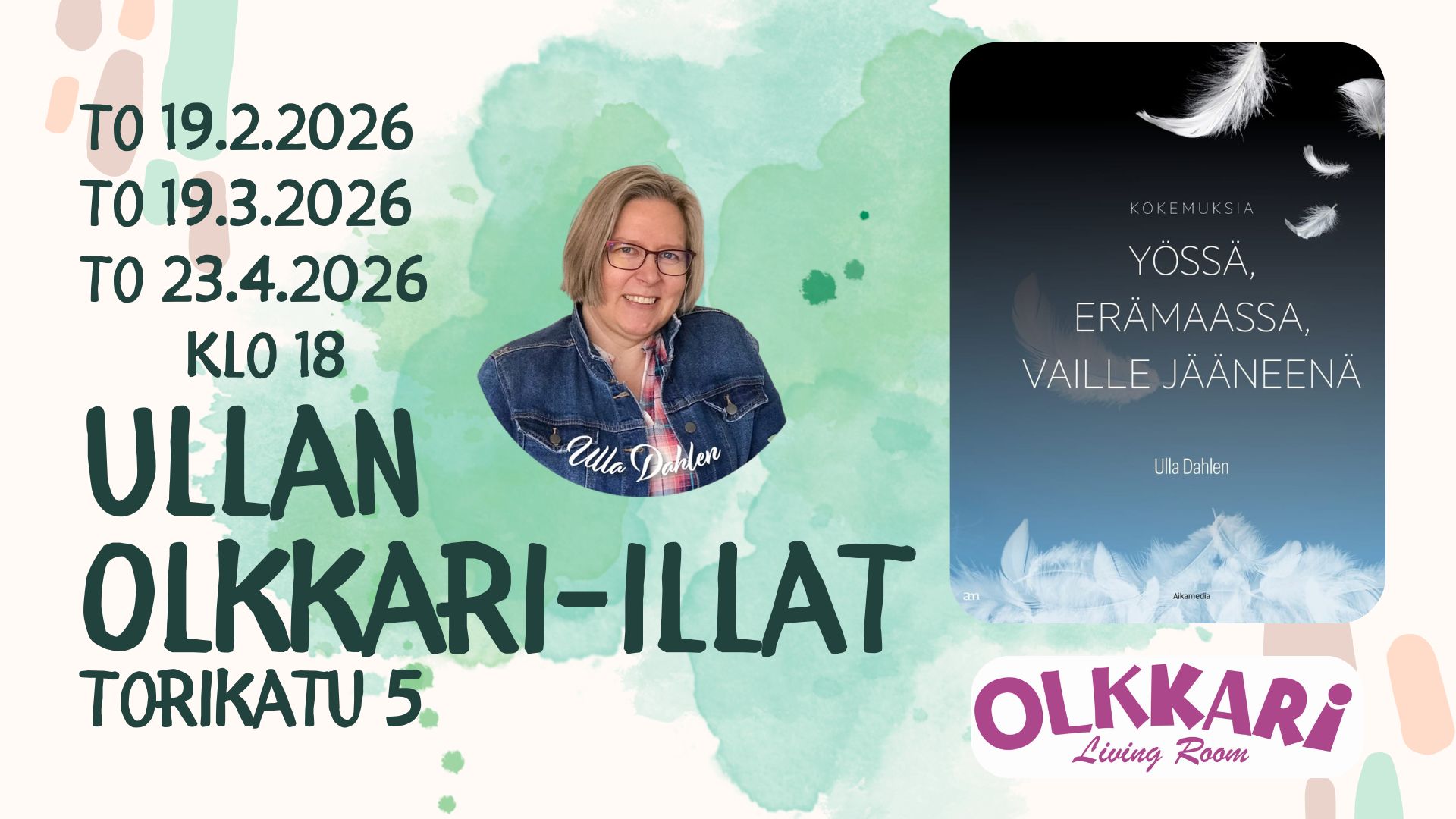 Ullan Olkkari-ilta + Lisää Google kalenteriin + iCal / Outlook export Päivä helmi 19 2026 Aika 18:00 - 19:15 Jaa tapahtuma