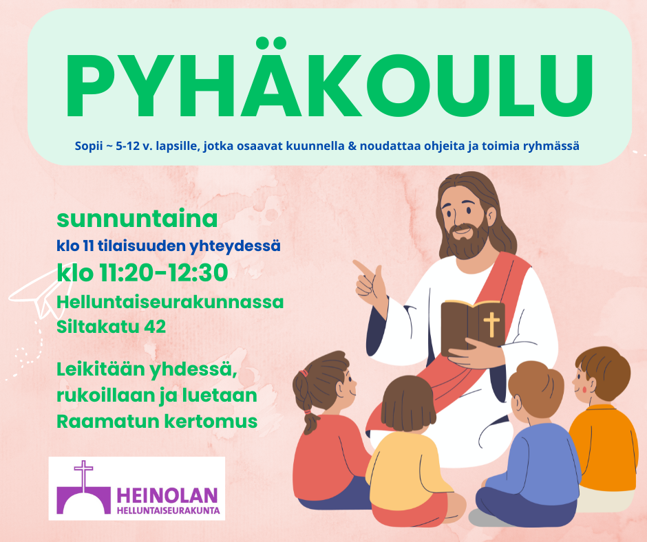 Pyhäkoulu järjestetään kouluvuoden aikana sunnuntaisin klo 11 jumalanpalveluksen aikana, siirrymme yhdessä alakerran pyhäkoulutiloihin noin klo 11:20 ja palaamme takaisin yläkertaan jumalanpalveluksen päättyessä. Pyhäkoulu sopii lapsille, jotka osaavat kuunnella & noudattaa ohjeita ja toimia ryhmässä. Tällä hetkellä mukana on 5-11 vuotiaita. Pyhäkoulussa kerrotaan Raamatun kertomuksia ja touhutaan yhdessä.
